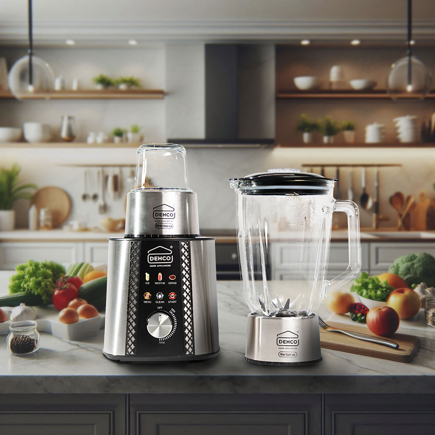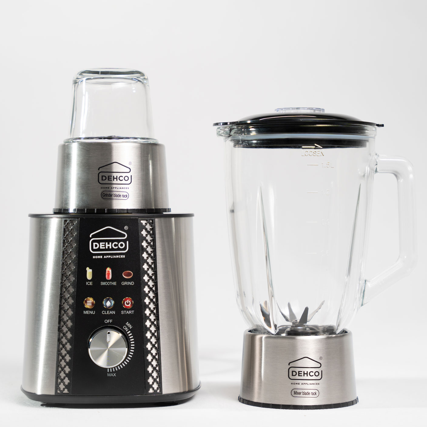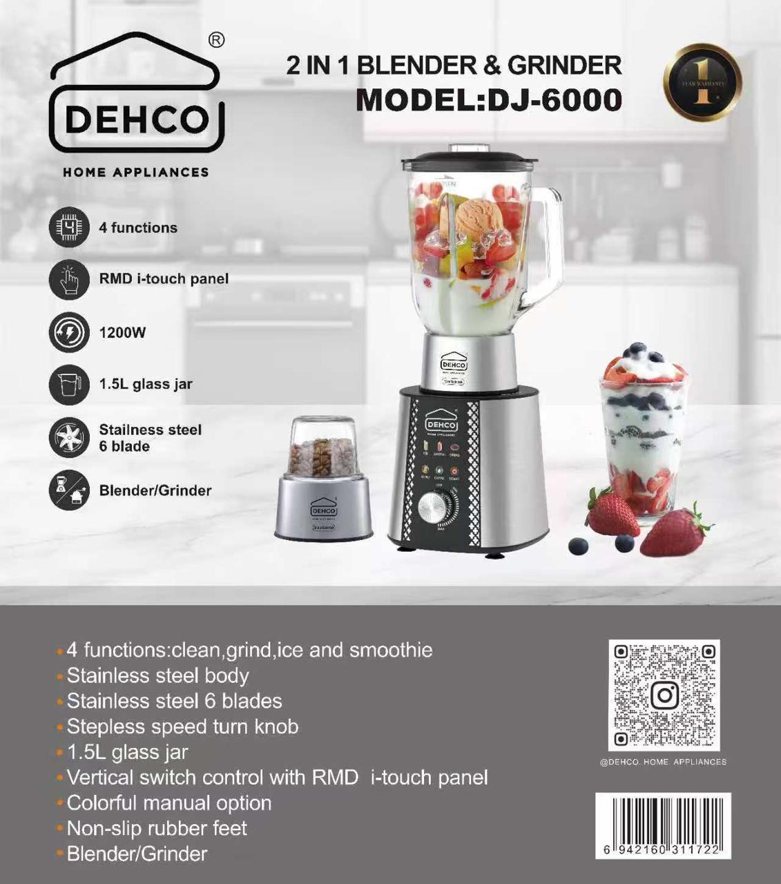 The DEHCO DJ-6000 is a versatile 2-in-1 blender and grinder designed for efficient kitchen tasks, combining power and convenience in a sleek stainless steel body. With a robust 1200W motor and stainless steel 6-blade system, it effortlessly handles blending, grinding, ice crushing, and smoothie preparation, delivering smooth and consistent results every time.