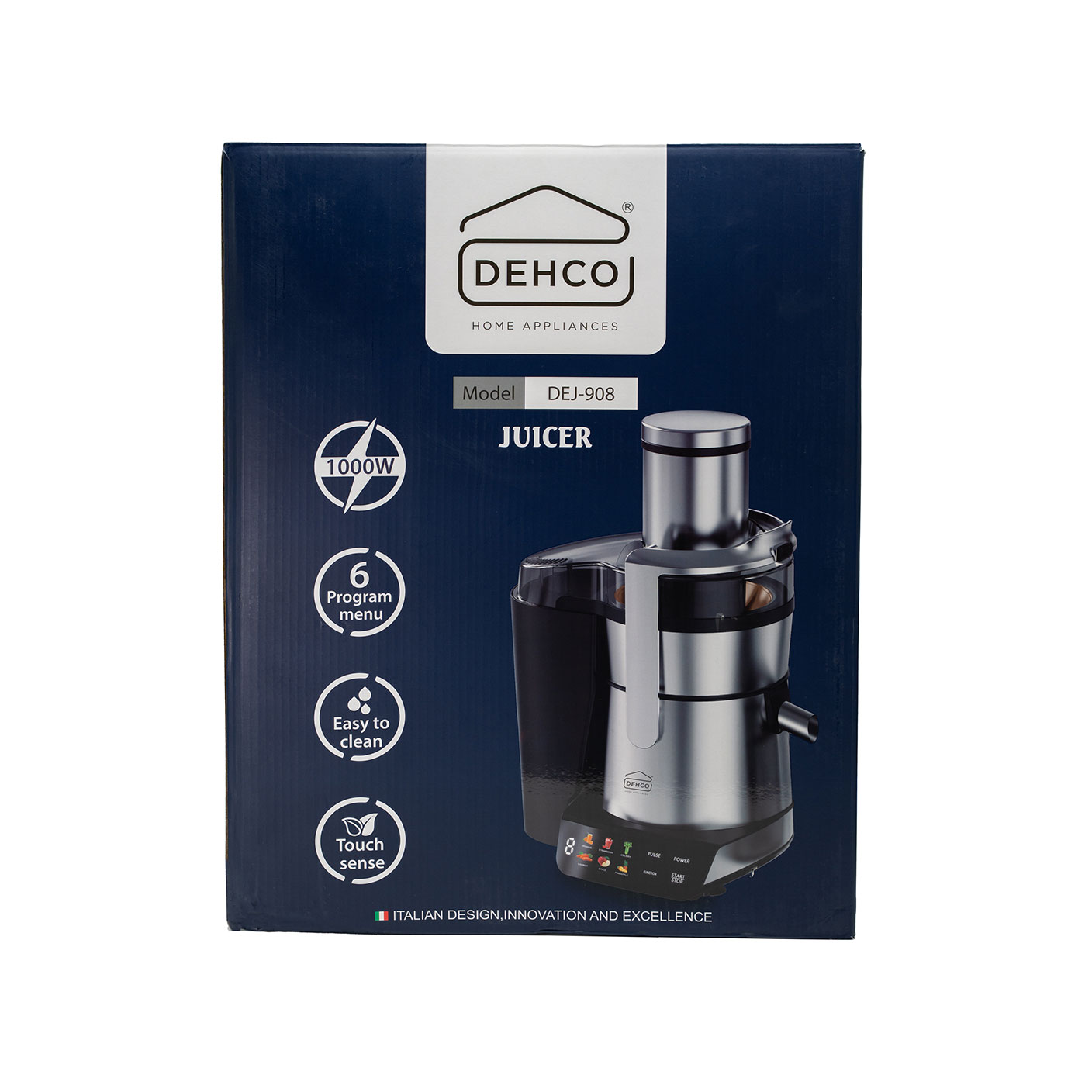 The Dehco Juicer DEJ-908, powered by 1000W, is a powerhouse for creating fresh, nutrient-rich juices effortlessly. Its Italian-inspired all-stainless steel body and touch-sensitive panel feature six pre-set programs tailored to various fruits and vegetables. The 65mm feeding tube accommodates whole produce without pre-chopping, while the easy-clean system allows quick rinsing in minutes. The anti-slip handle with safety lock ensures secure, hassle-free operation.