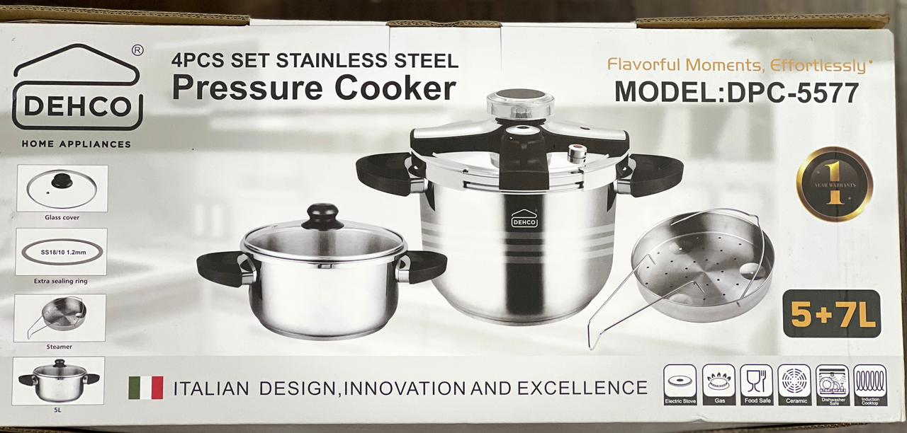 The DEHCO DPC-5577 is a comprehensive 4-piece stainless steel pressure cooker set designed for efficient and flavorful cooking, including a 5L + 7L capacity configuration with a steamer, glass cover, extra sealing ring, and compatibility with electric stoves, gas, food-safe ceramics, dishwashers, and induction. Its robust construction ensures safety with pressure regulation features, allowing for effortless preparation of meals while retaining nutrients and flavors, ideal for busy households.