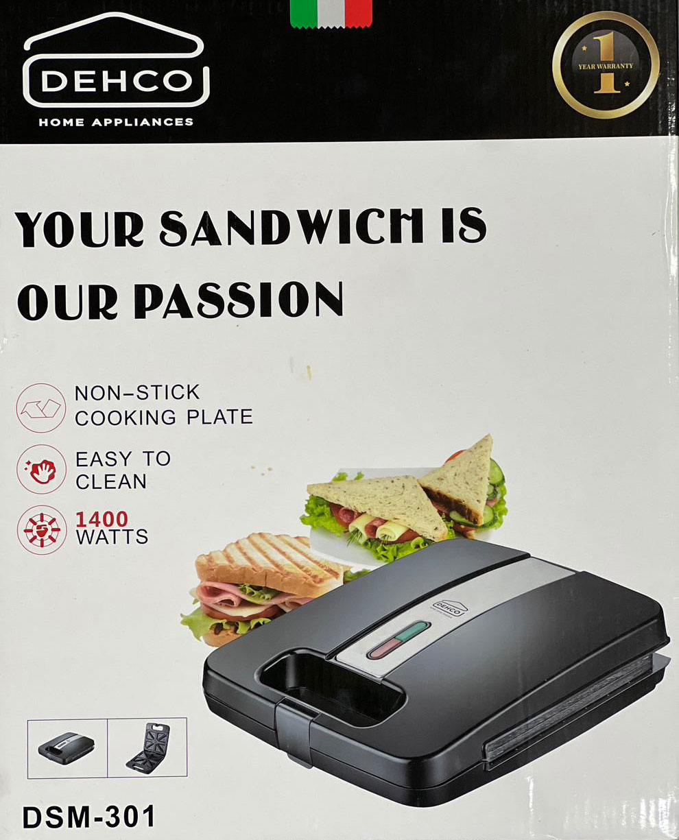 The DEHCO DSM-301 sandwich maker is a compact and efficient appliance dedicated to crafting perfect sandwiches, featuring non-stick cooking plates for effortless food release and easy cleaning, powered by a robust 1400 watts for quick heating and even toasting. Its simple design includes a secure latch and indicator lights, making it user-friendly for quick breakfasts or snacks, with a focus on passion for sandwich preparation as highlighted in its branding.