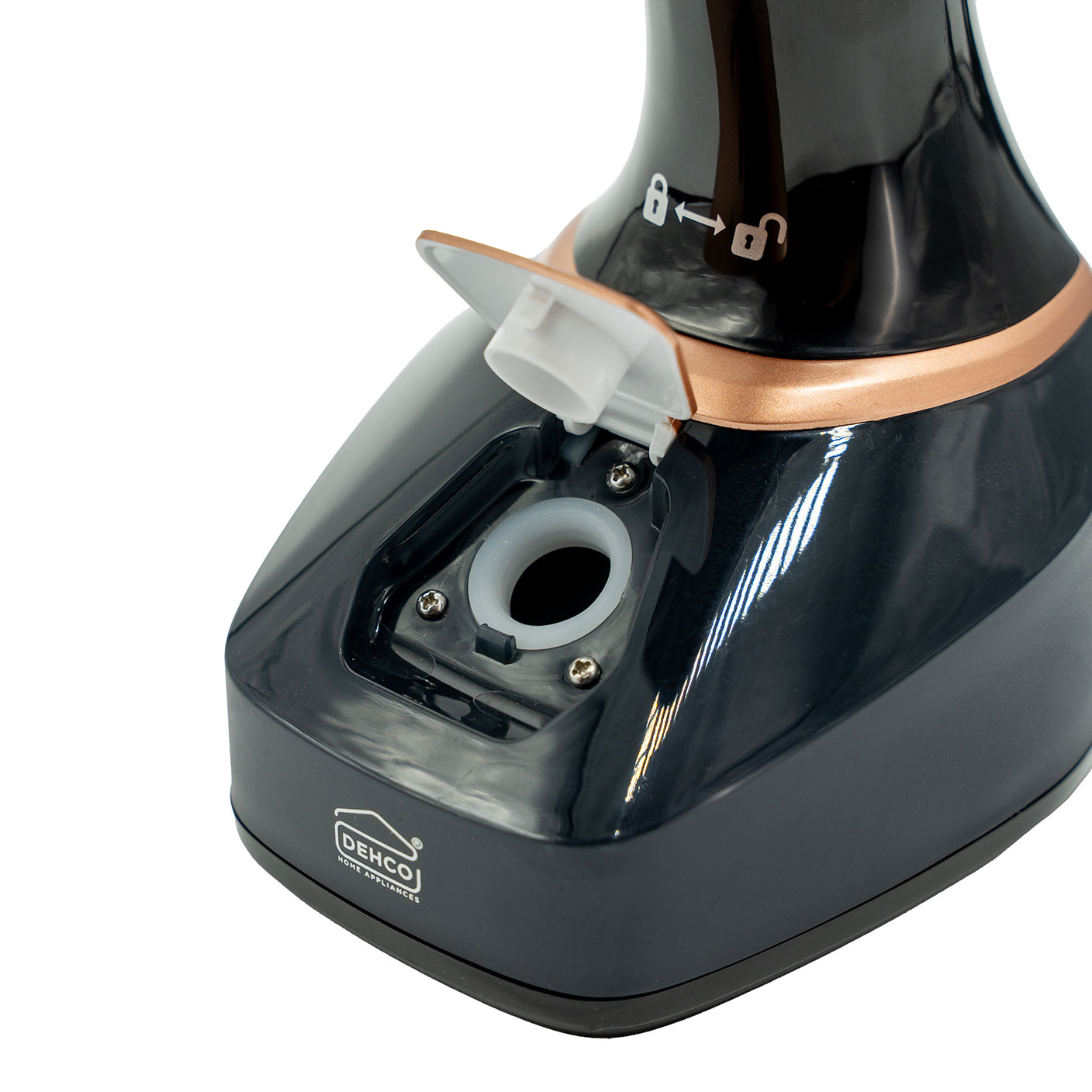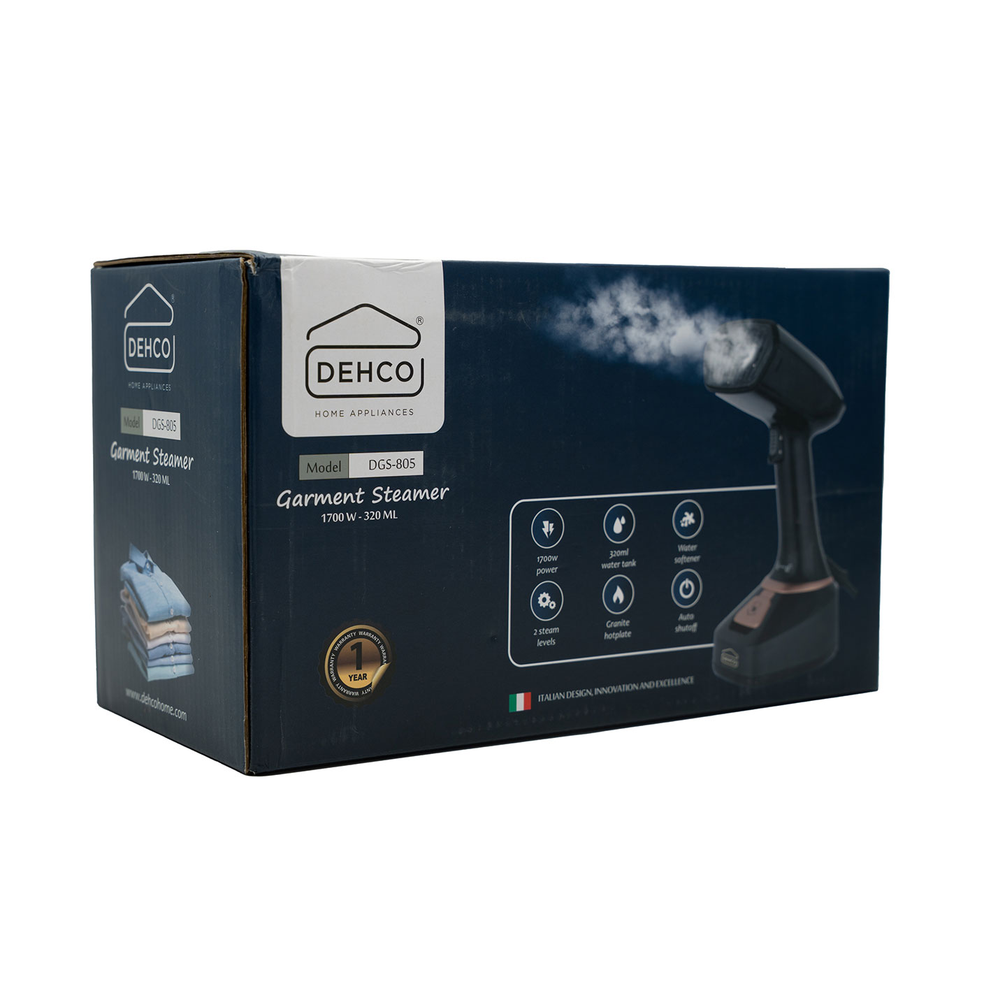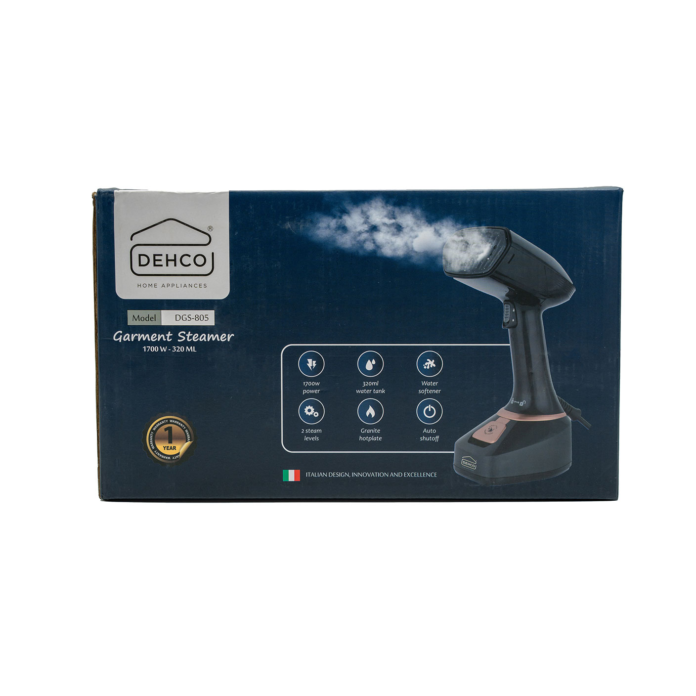 The Dehco Garment Steamer DGS-805, at 1700W, delivers wrinkle-free clothes with professional results at home. Its detachable 320ml water tank and power steam brush produce 15-25g/min continuous steam, adjustable across levels for delicate fabrics. The granite hotplate and auto shut-off enhance safety, while the water softener prevents buildup. 360° rotation ensures smooth gliding over garments.