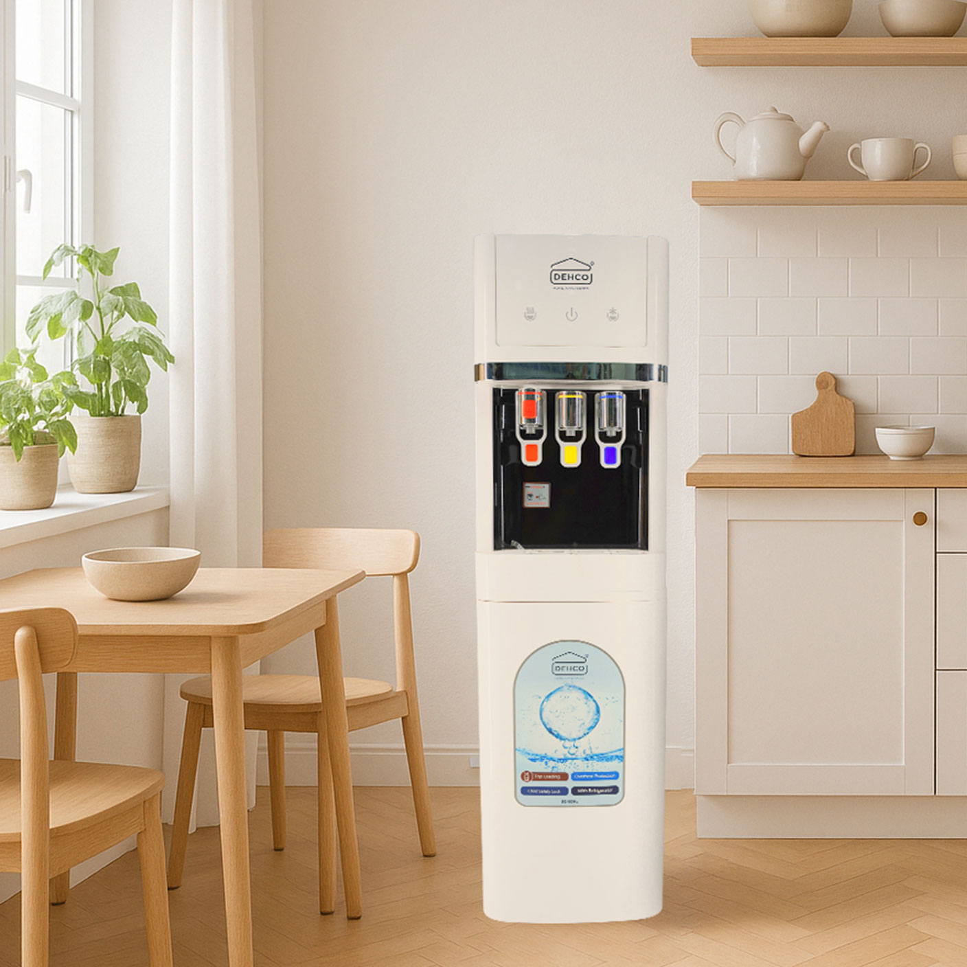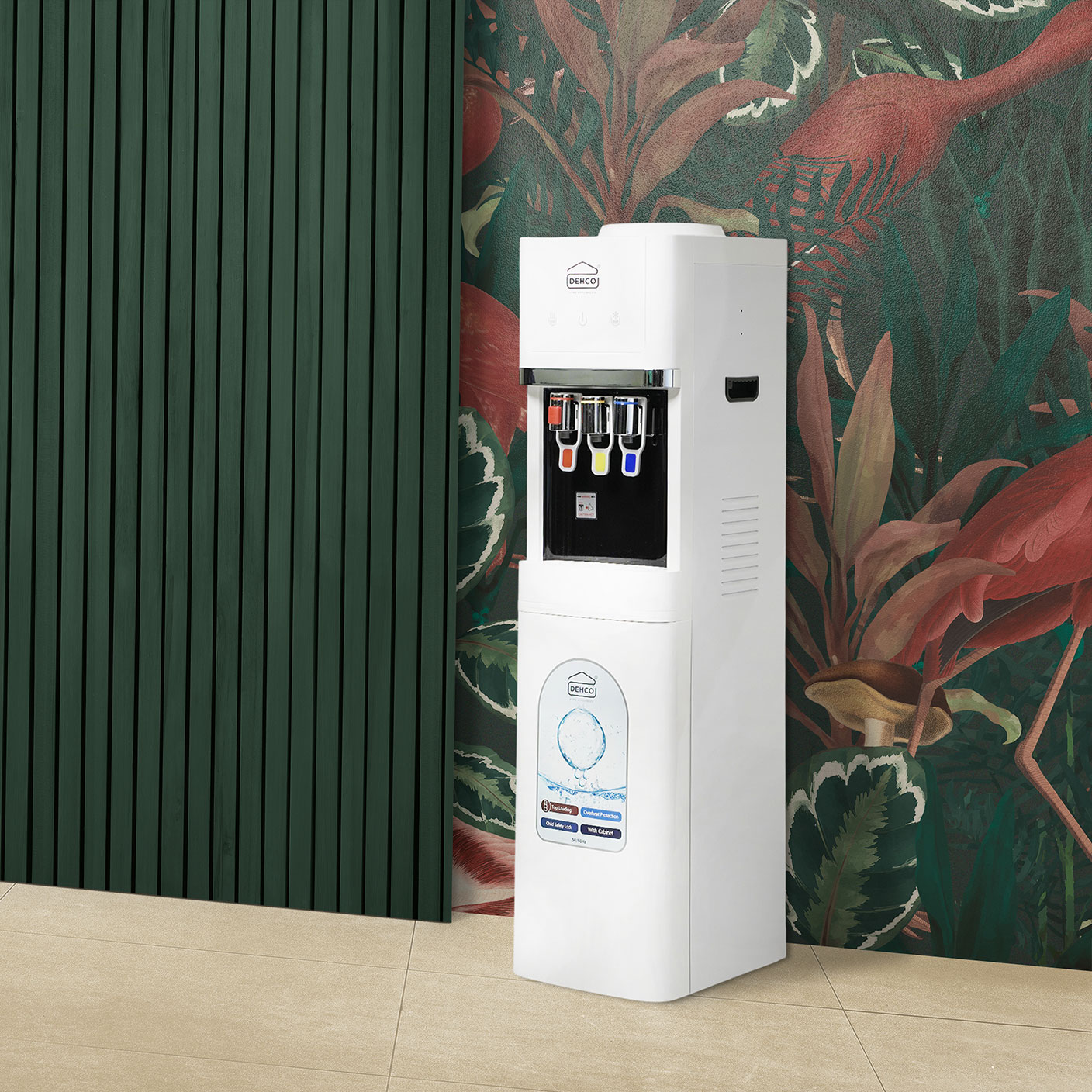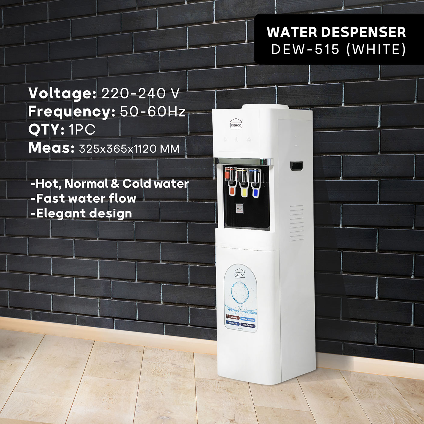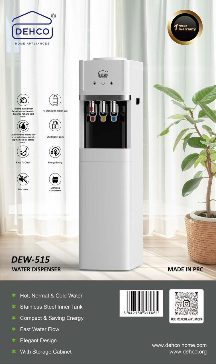 The DEHCO DEW-515 is a versatile floor-standing water dispenser delivering hot, normal, and cold water, with a stainless steel inner tank ensuring hygiene and robustness, compact energy-saving features, fast water flow, and an elegant design complemented by a storage cabinet for added utility. It boasts tri-temp push buttons for convenient dispensing, support for standard 5-gallon jugs, direct water line connection, child safety lock, easy cleaning, low noise operation, and a Qiangjiang compressor for efficient cooling and reliability.