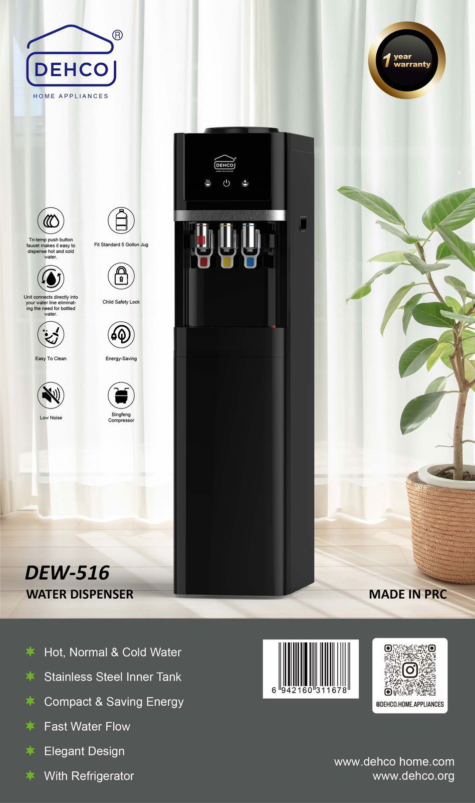 The DEHCO DEW-516 is an advanced floor-standing water dispenser offering hot, normal, and cold water functionalities, featuring a stainless steel inner tank for maximum hygiene and durability, compact and energy-saving design, fast water flow, and an elegant aesthetic ideal for contemporary settings. Equipped with tri-temp push buttons for user-friendly dispensing, compatibility with standard 5-gallon jugs, direct connection to water sources, child safety lock, easy-to-clean surfaces, low noise levels, a Bingfeng compressor for superior cooling performance, and a built-in refrigerator for versatile storage.