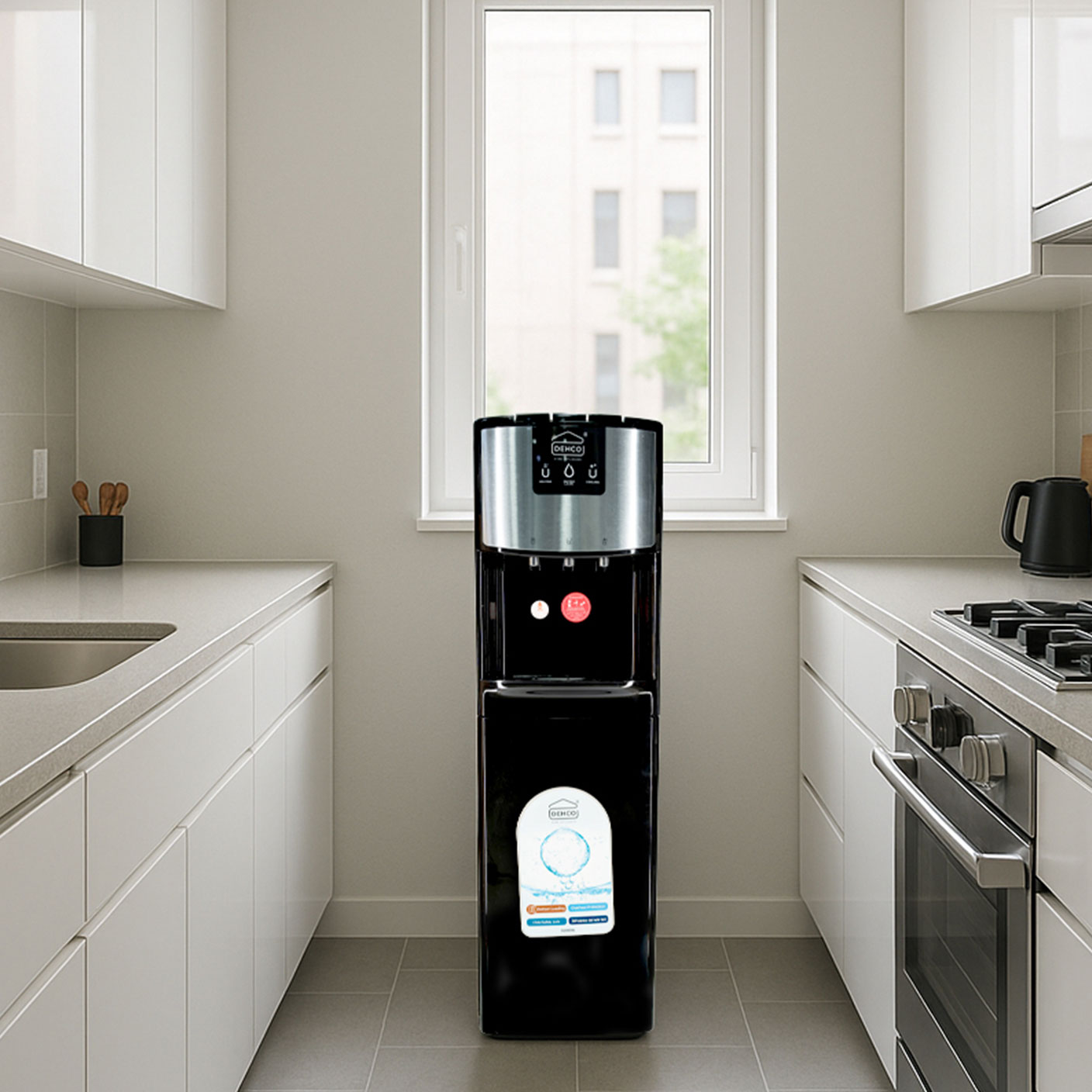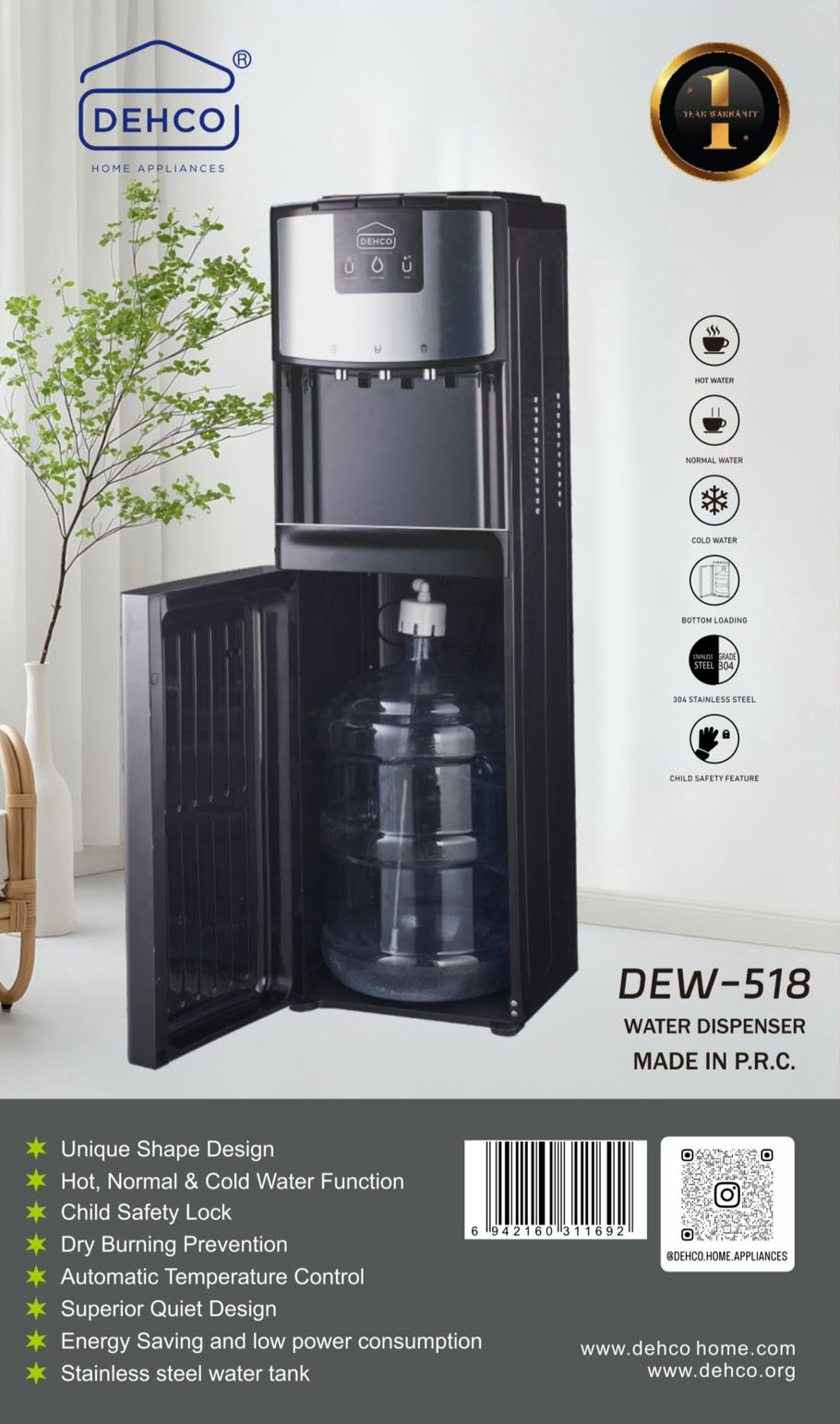 The DEHCO DEW-518 is a uniquely shaped floor-standing water dispenser with hot, normal, and cold water functions, incorporating a stainless steel water tank for hygiene and strength, bottom-loading design for easy bottle changes, child safety lock, dry burning prevention, automatic temperature control, and a superior quiet design to minimize noise during operation. It features energy-saving technology with low power consumption, 304 stainless steel construction, and additional child safety features, ensuring safe and efficient hydration for all users.